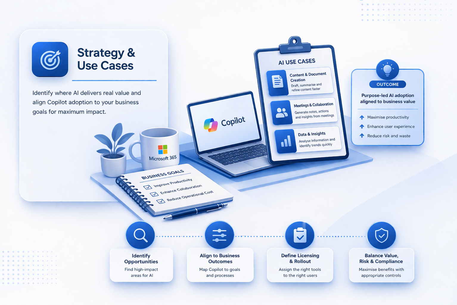 I work with organisations to identify practical, high-impact use cases for Microsoft 365 Copilot, aligned to business goals, user needs, and existing ways of working. This ensures AI is introduced with purpose, not just curiosity.