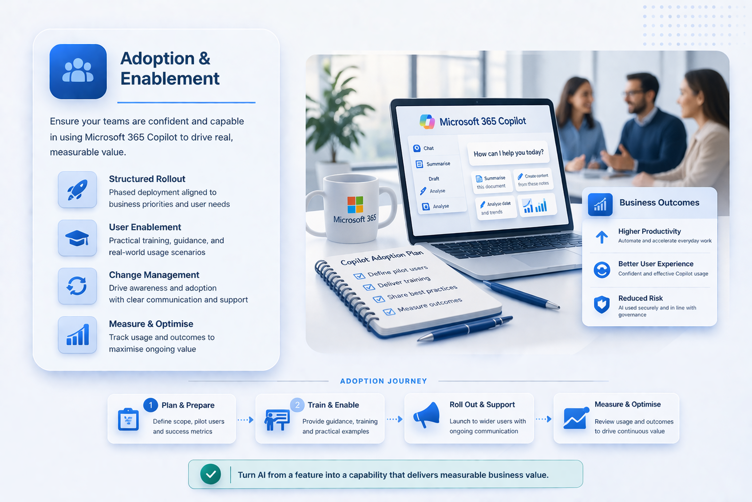 I help organisations roll out Microsoft 365 Copilot in a structured, practical way, ensuring users understand how to use it effectively, securely, and in line with your governance model. This turns AI from a feature into a capability that delivers measurable outcomes.