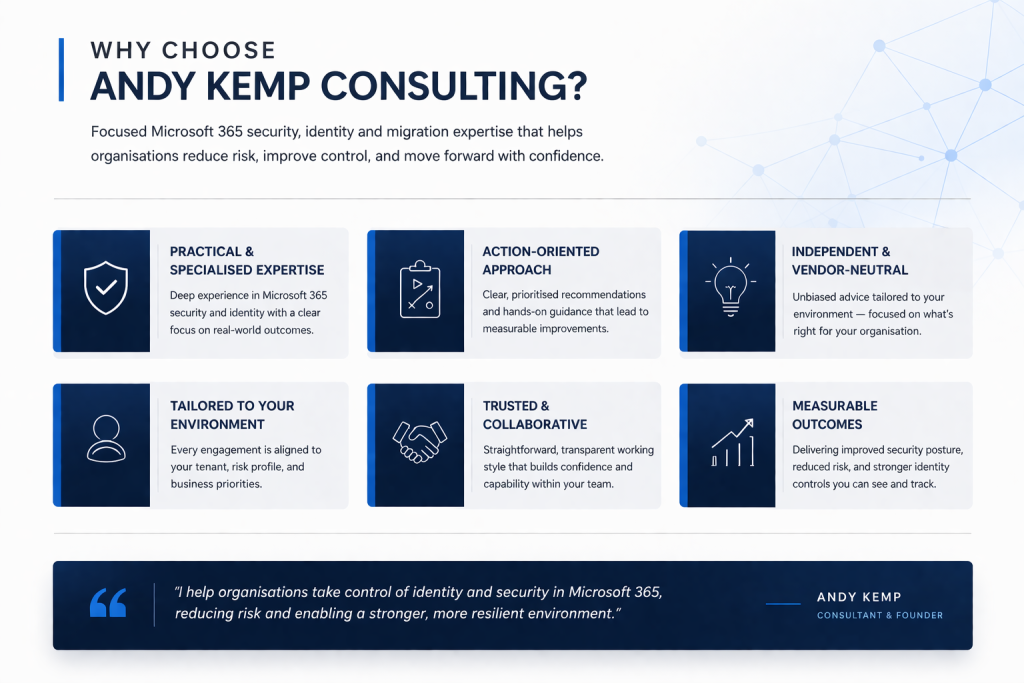 I help organisations define where AI delivers real value, assess their current Microsoft 365 setup, and implement the governance needed to adopt AI securely and effectively.